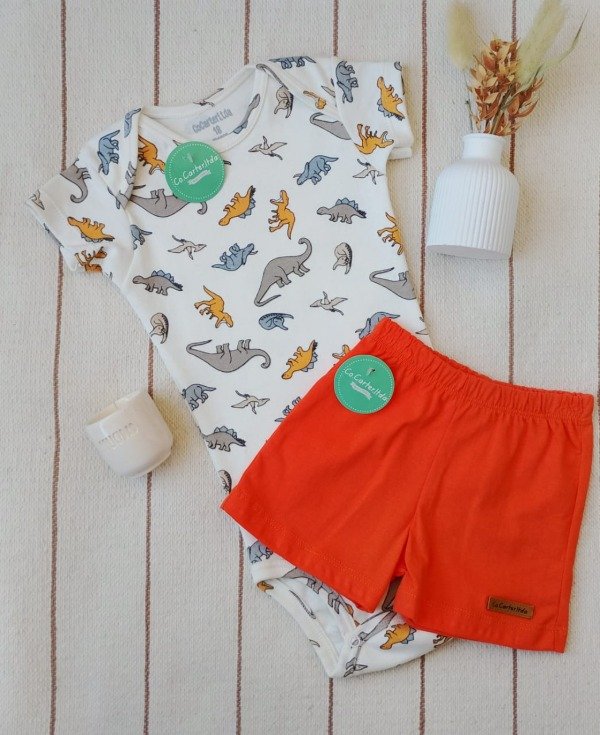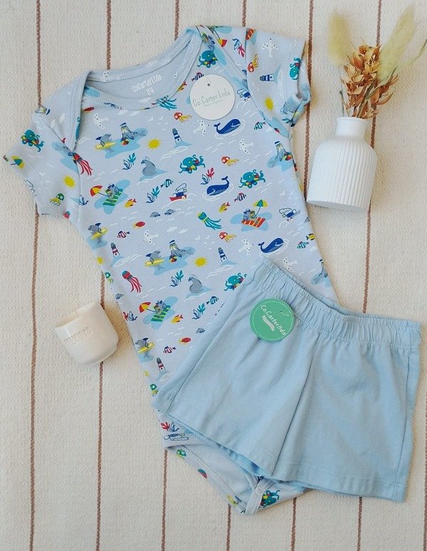 Body + pantalón ideal para el verano de tu bebé. Con su diseño de manga corta y cartera en el hombro, facilita el cambio de pañal sin necesidad de mover a tu pequeño, todo mientras luce una estampa central que complementa la colección.